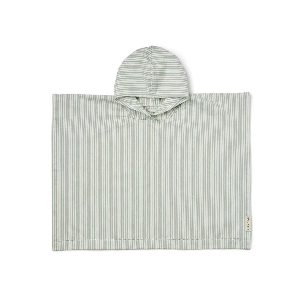 Красиво детско пончо за плуване в синьо-крем цвят с райета, подходящо за деца на възраст 5-6 години, от Liewood.
