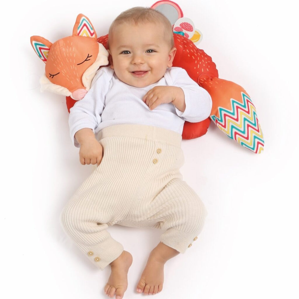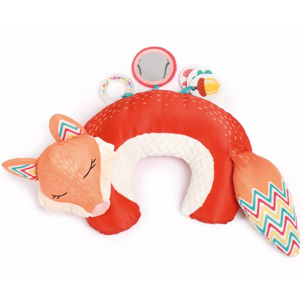 Тази активираща възглавница с лисица расте заедно с детето ви: подходяща е както за игра на бебето, така и като удобна опора за пътуване за по-голямо дете.