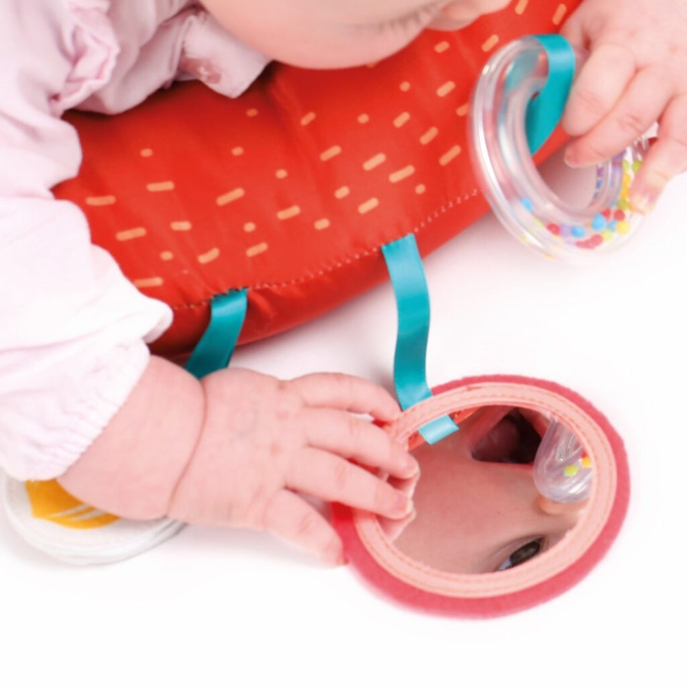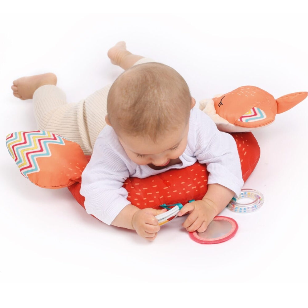 Активиращата възглавница „лисица“ от Ludi е многофункционален аксесоар, който подпомага развитието на бебето от 3-месечна възраст.