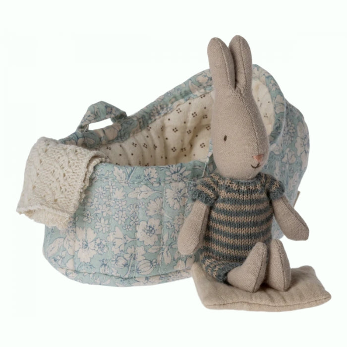 Maileg Micro Bunny в тъмносиня рокля и носилка