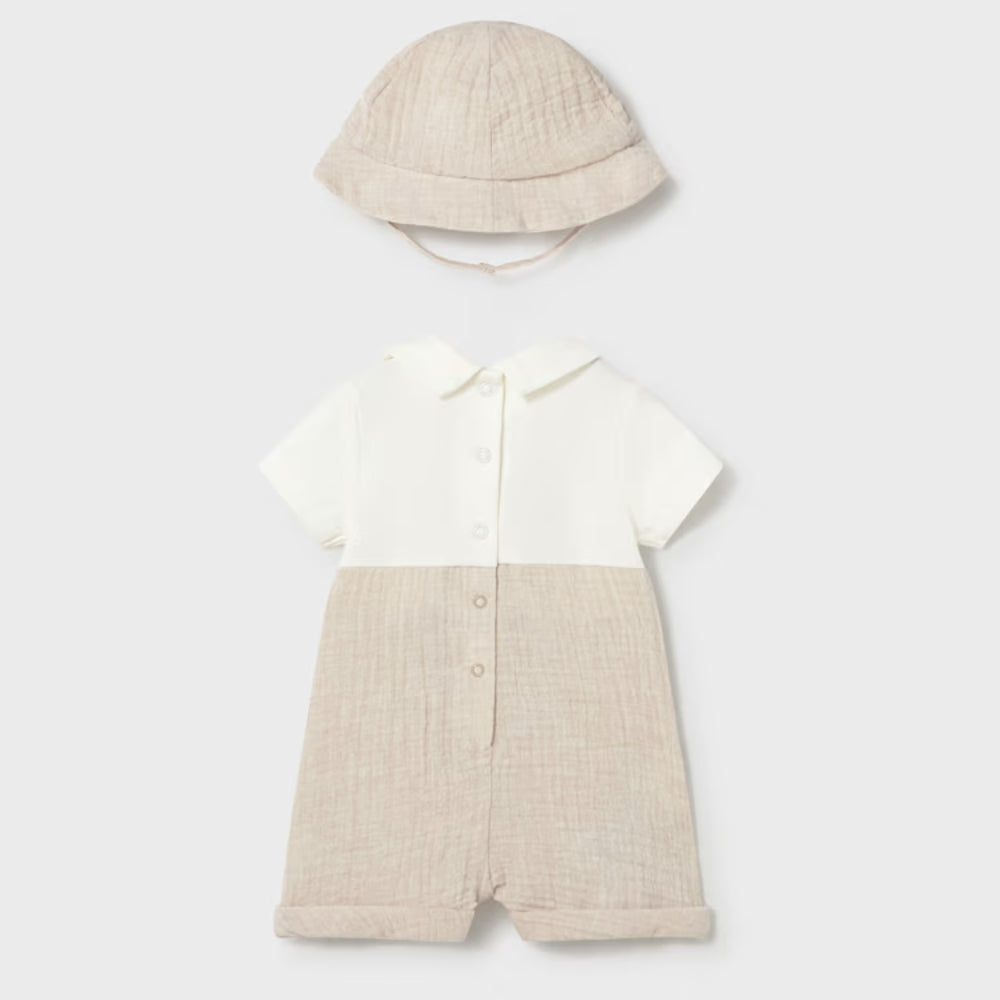 Der Babystrampler mit imitierter Latzhose und passender Mütze bilden ein stimmiges Styling, das von Mayoral für die ersten Tage des Babys entworfen wurde.