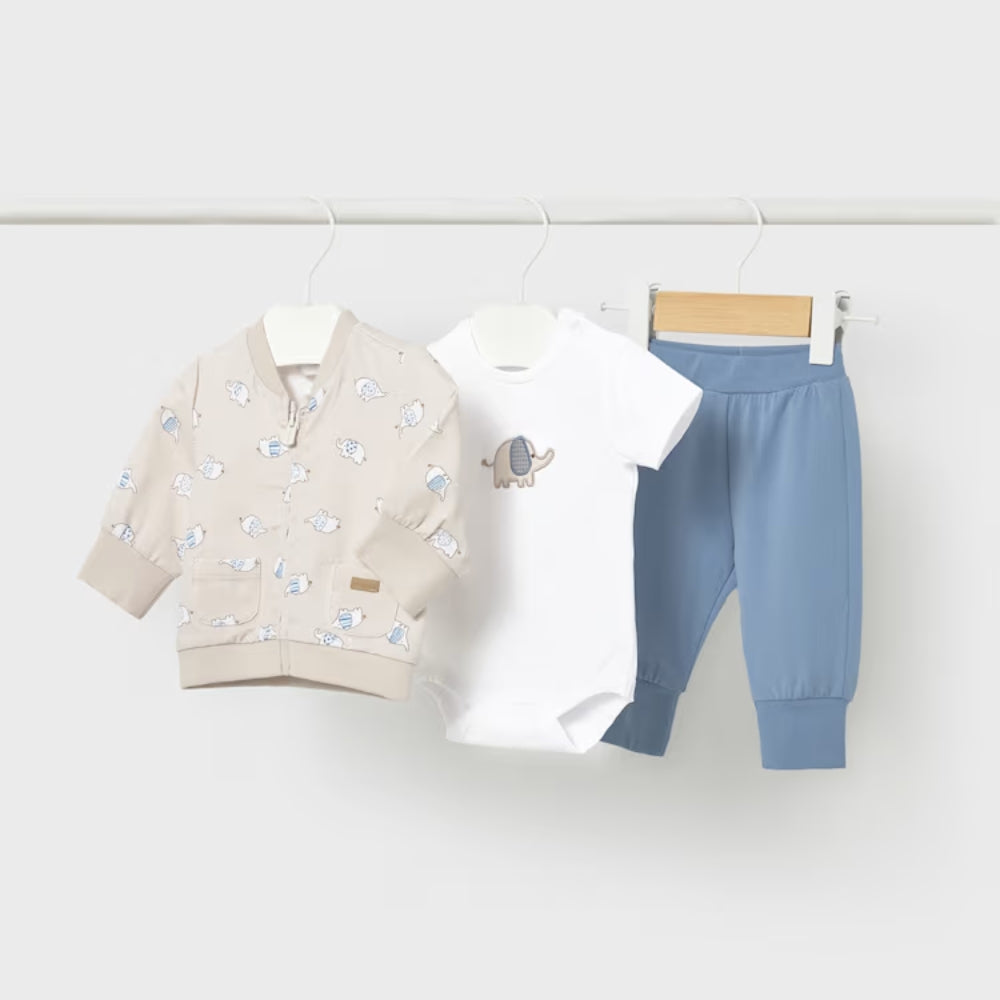 Das Set besteht aus einem weißen Body mit aufgesticktem Baby-Elefanten, einem beigen Sweatshirt mit Reißverschluss und einer blauen Jogginghose, die alle zusammen ein komplettes Set ergeben.