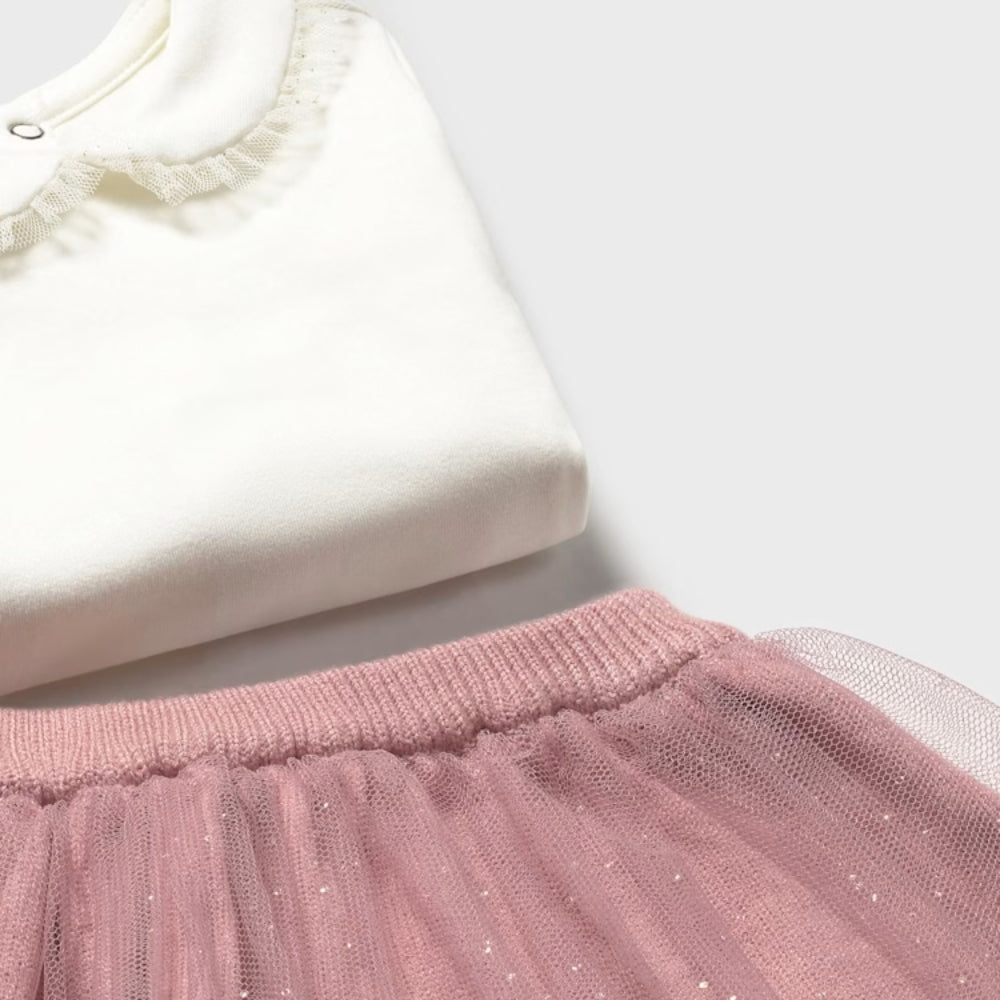 Този уникален комплект за новородени от Mayoral включва пуловер без копчета, който е лесен за обличане дори и за най-малките бебета, удобно боди с дълги ръкави и момичешка пола.