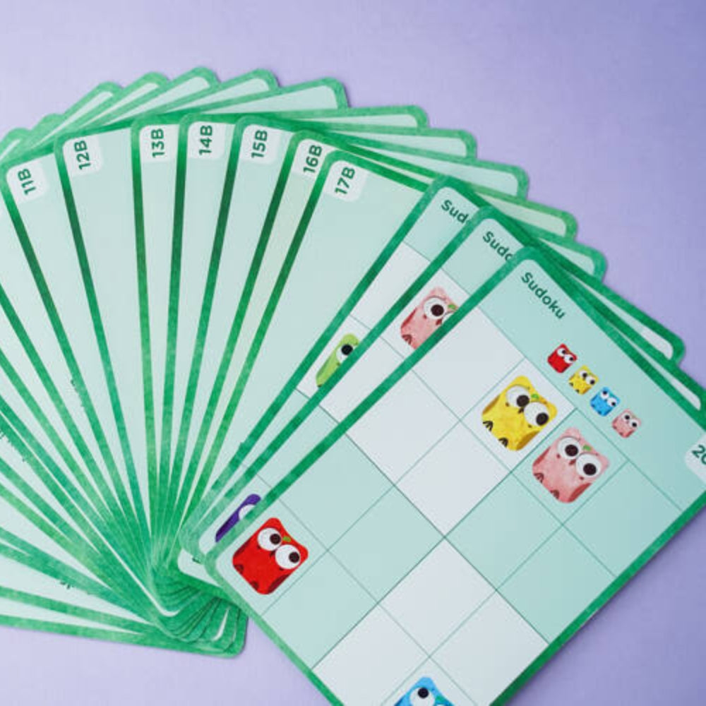 Комплектът включва 60 картонени сови, 10 картонени числа, дървен куб, двустранно игрово табло, 40 карти с пъзели за решаване, лист със стикери, екологична чанта, плакат и ръководство за родители.