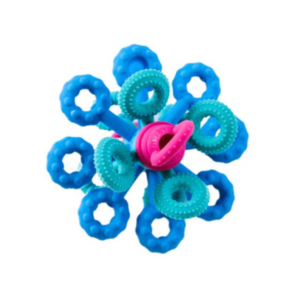 Нейните 18 гъвкави силиконови ръце насърчават разтягането, стискането, усукването и хапането, докато назъбените ръбове на трите пръстена дават приятни, нежни вибрации, когато се въртят.