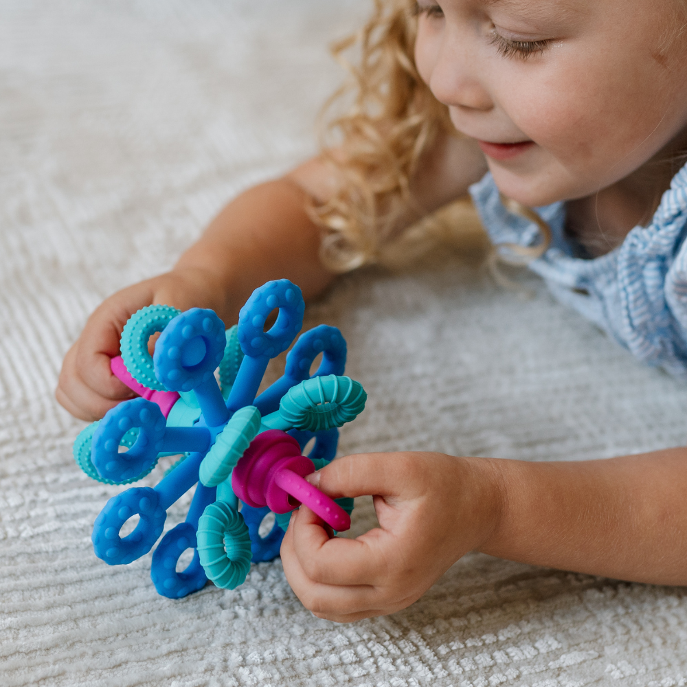 Тази сензорна играчка съчетава атрактивна форма с функционалност – мекият силикон е приятен на допир, а интерактивните елементи насърчават самооткриването.