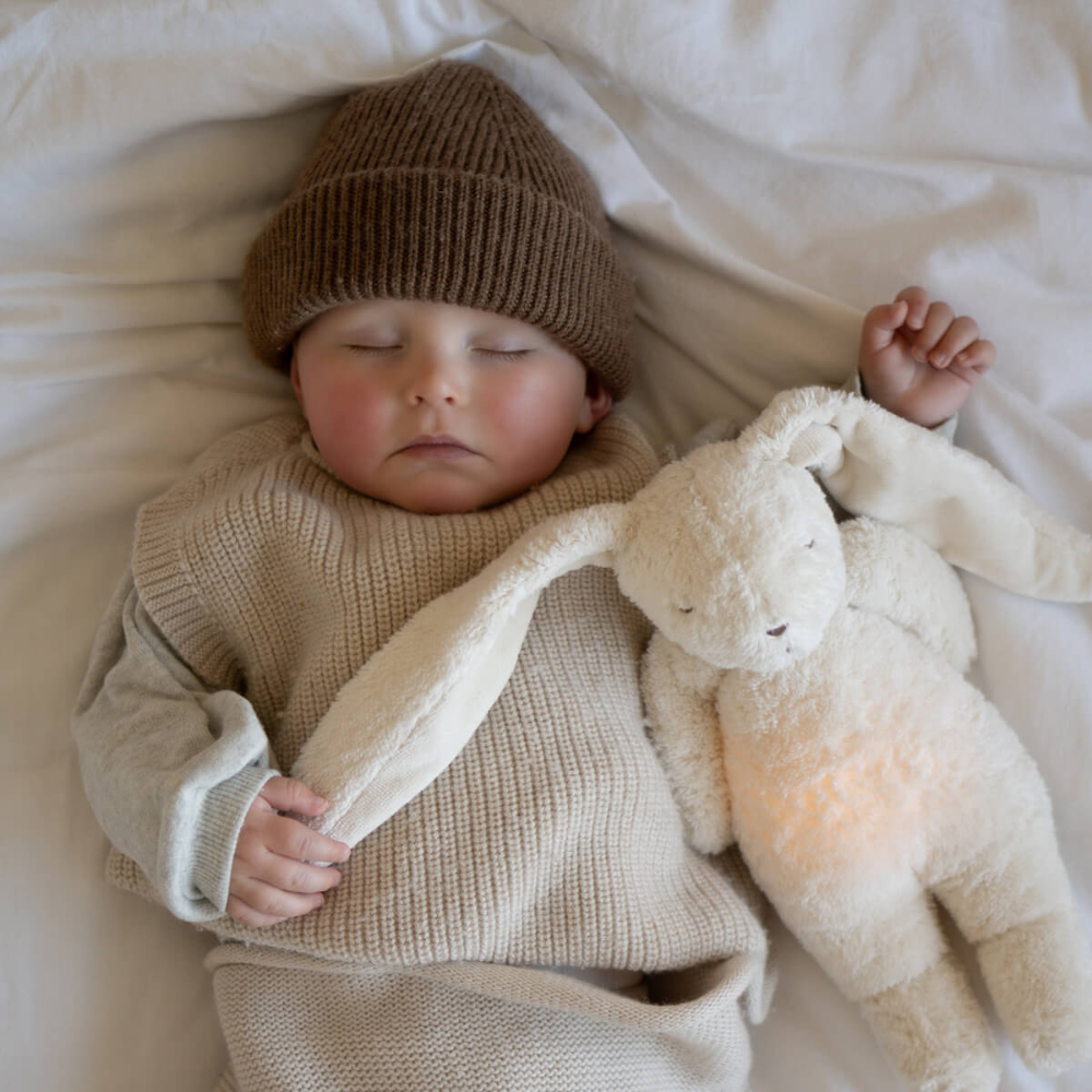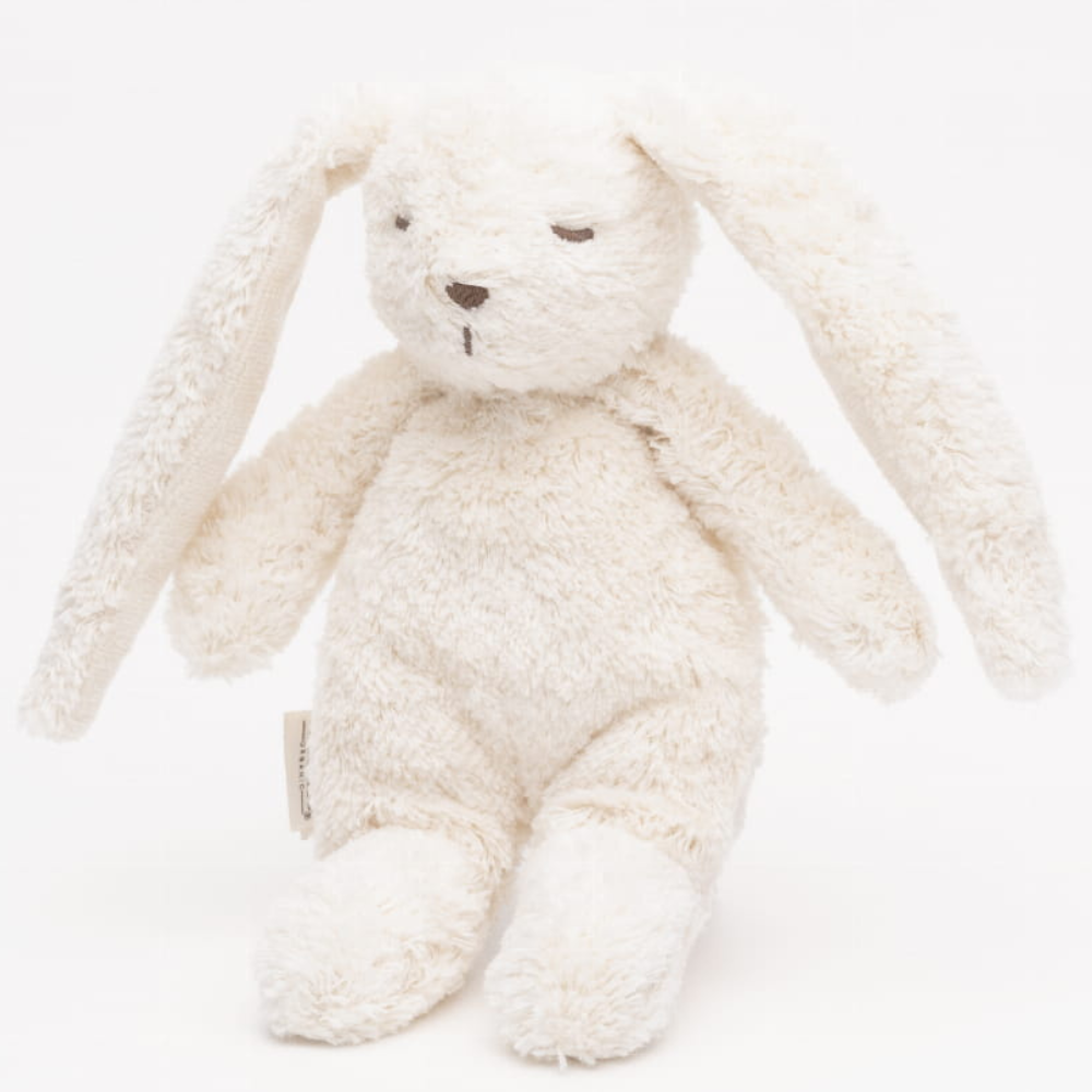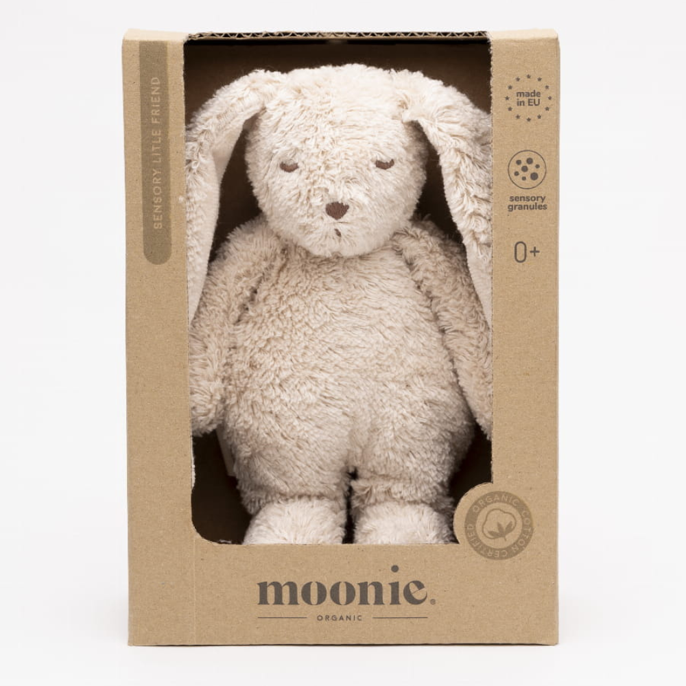 Марката Moonie е използвала безопасни, тактилни материали – органичен памук и мека пълнеж – така че играчката е подходяща и за чувствителната кожа на бебетата.