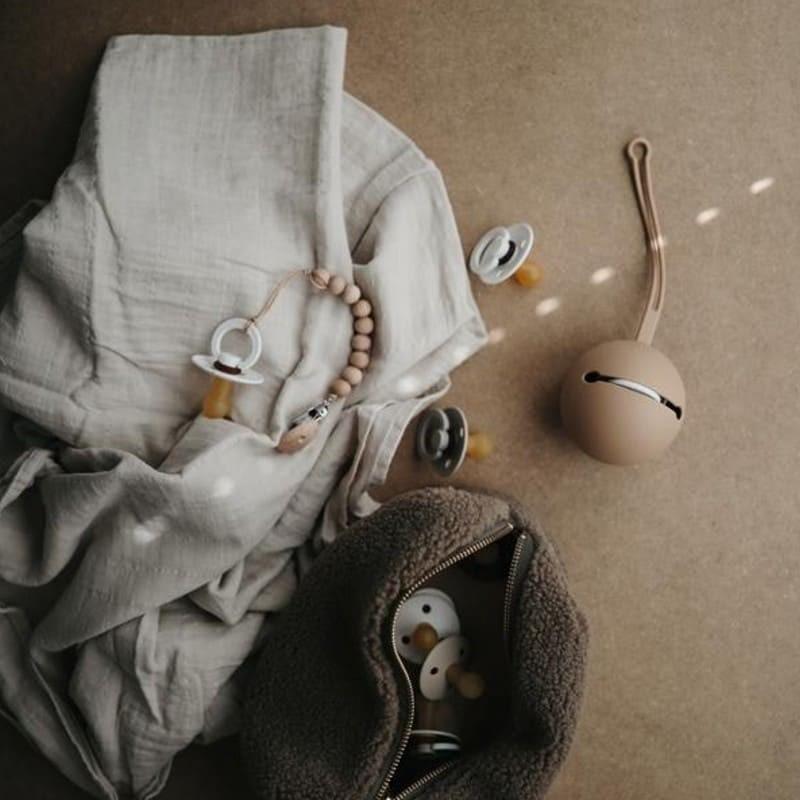 Кутията за биберон Mushie Ball Blush Stroller Pacifier Case има специална закопчалка, с която може да се закрепи към количката, детското креватче или където и да е другаде.