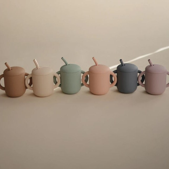 Чашата Mushie Straw Mug е проектирана така, че да се побира идеално в малките ръчички, както и да подпомага развитието на речта на бебето.