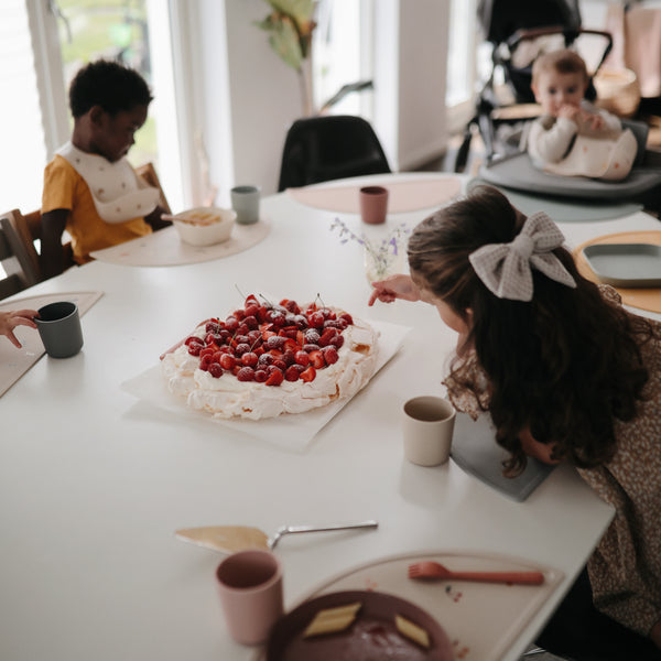Силиконовите подложки за маса Mushie имат класически дизайн, който им придава вечен и елегантен вид, с допълнителното предимство, че могат да се съчетават с престилка и комплект прибори за хранене.