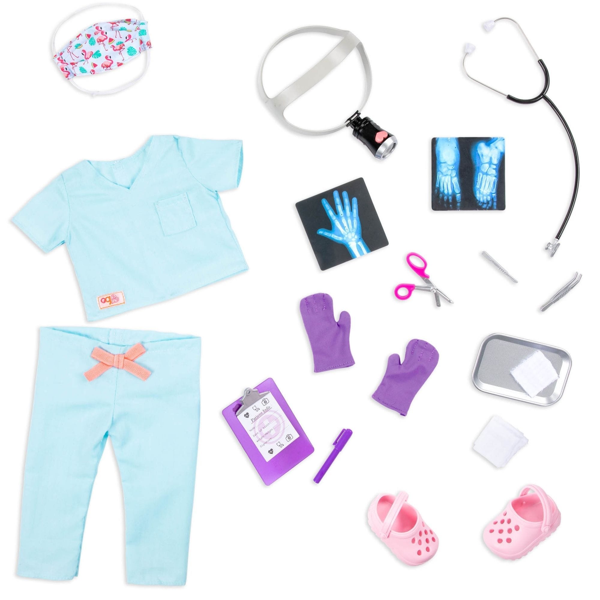 - Комплектът включва: кукла 46 см, блуза, панталони, обувки, стетоскоп, хирургическа маска, фенерче за глава, ръкавици, рентгенови снимки, тава, памучни тампони - превръзки, хирургически пинсети, скалпел, медицински ножици, химикал, медицински формуляр