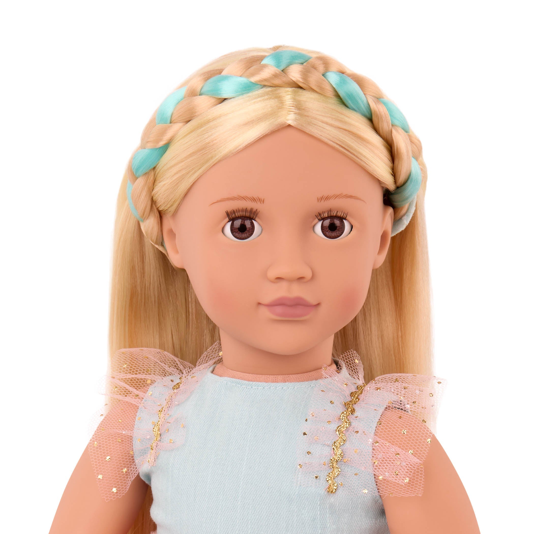Куклата Our Generation има подвижни ръце, крака, глава и клепачи, мек торс и красива коса.