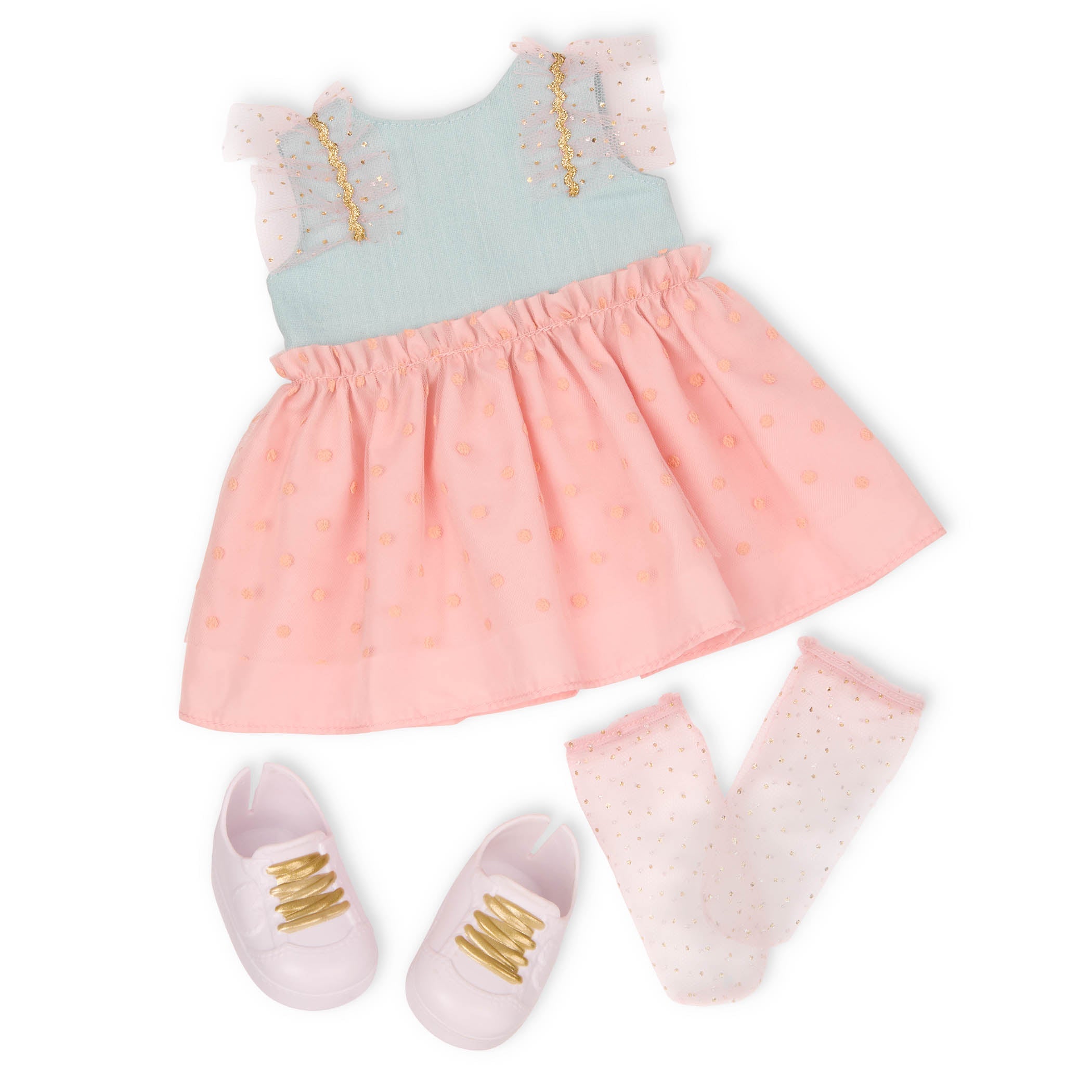 - Включва: кукла 46 см, рокля с висока талия, бельо, мрежести чорапи с деликатни златисти петънца, бели обувки със златисти връзки, 2 клипса за коса, 2 метални щипки във формата на сърце, гребен, книжка с постъпкови снимки, показващи как да създадете зашеметяващи прически