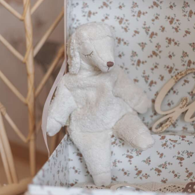 Ръчно изработената овчица е идеална за бебета на възраст от 2 месеца.