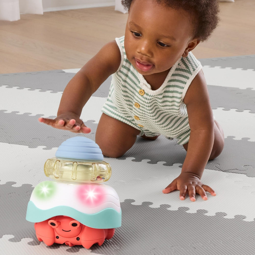 Интерактивният рак се движи весело, излизайки от под черупката, което насърчава начинаещите да пълзят да гледат и да реагират.