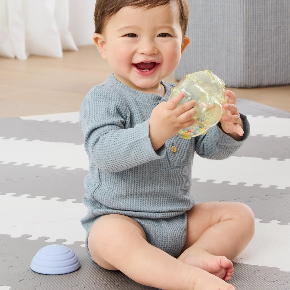Тази играчка за пълзене, пълна с действие, е проектирана да расте заедно с вашето бебе, подпомагайки развитието на двигателните умения и насърчавайки пълзенето.