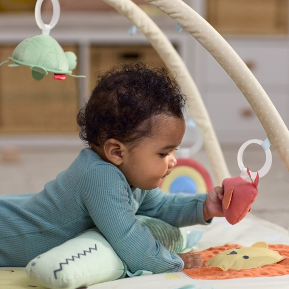 - Съдържание на комплекта: 5 сензорни висулки (дрънкалка с огледало, пискалка с гризалка, дрънкалка с етикети, дървена гризалка, шумяща дъга), възглавница с форма на крокодил за лежане по корем, шумящи елементи и текстури върху постелката