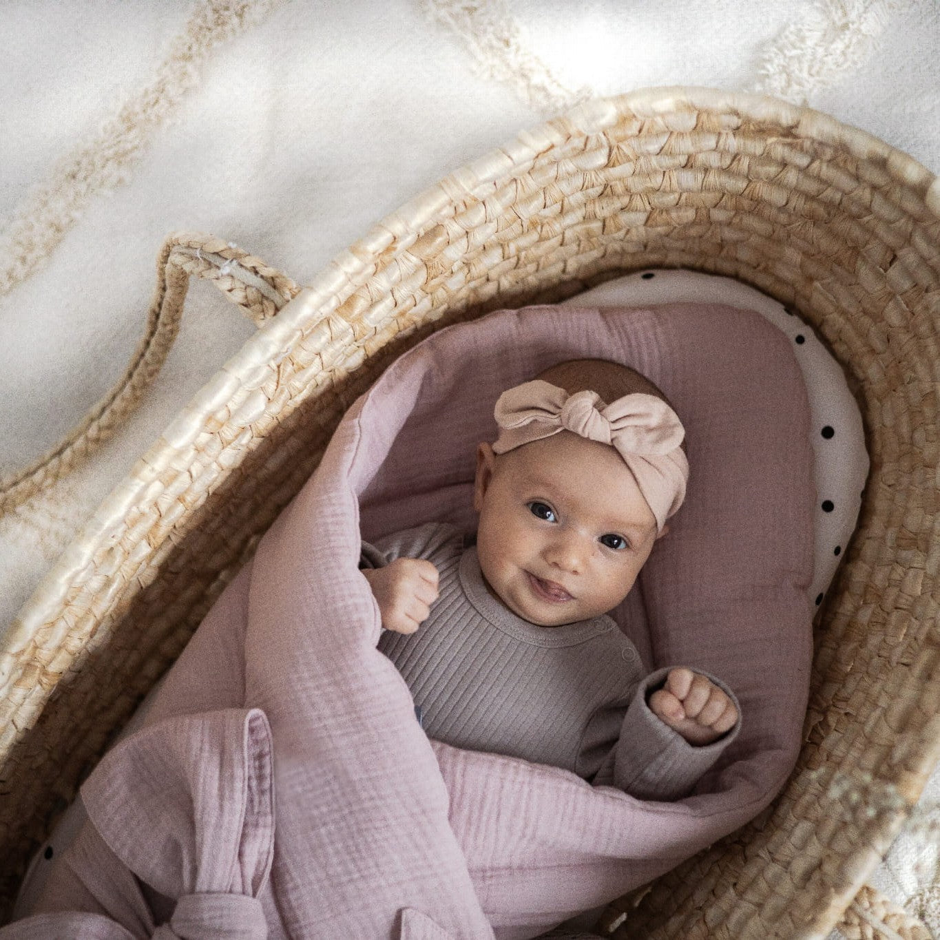 Муслиновата бебешка шапка Sand от Sleepee с папийонка ви позволява да я регулирате според желанието си, като я завържете по-стегнато или по-хлабаво.