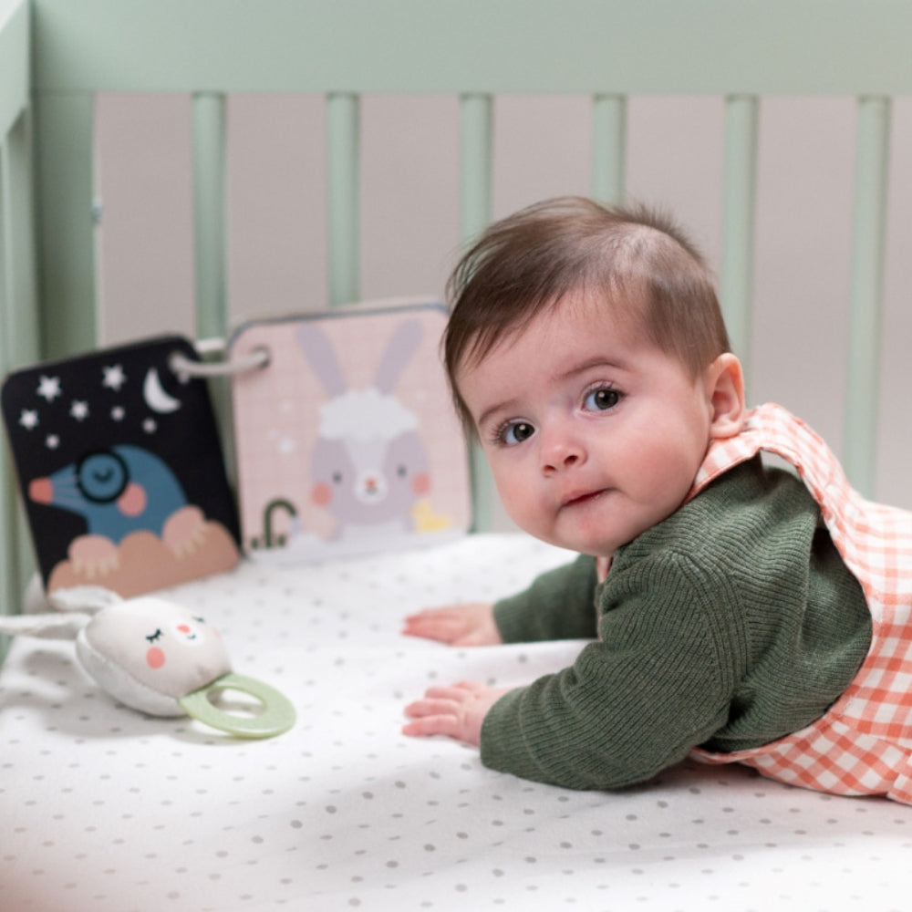 Комплект от 7 двустранни карти (14 картинки) и пръстен за карти. Двустранните карти могат да се използват за визуално стимулиране на очите на бебето през деня чрез контрастни изображения. Вечерта другата страна на картите може да се използва, за да разкажете нежна, успокояваща история. Тази втора страна на картите може да се използва и за разказване на историята на зайчето и неговото ежедневие, което я прави идеална за първите моменти с малкото дете и помага за научаването на прости думи и действия.