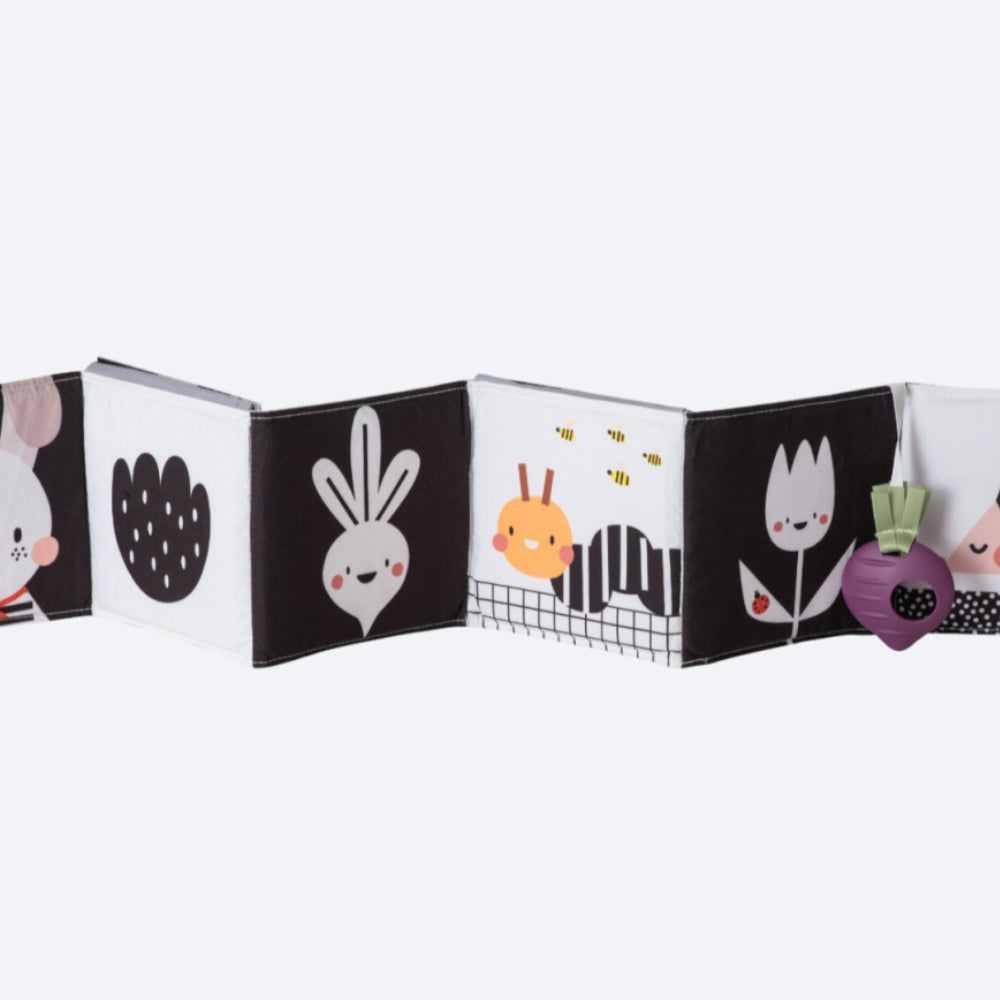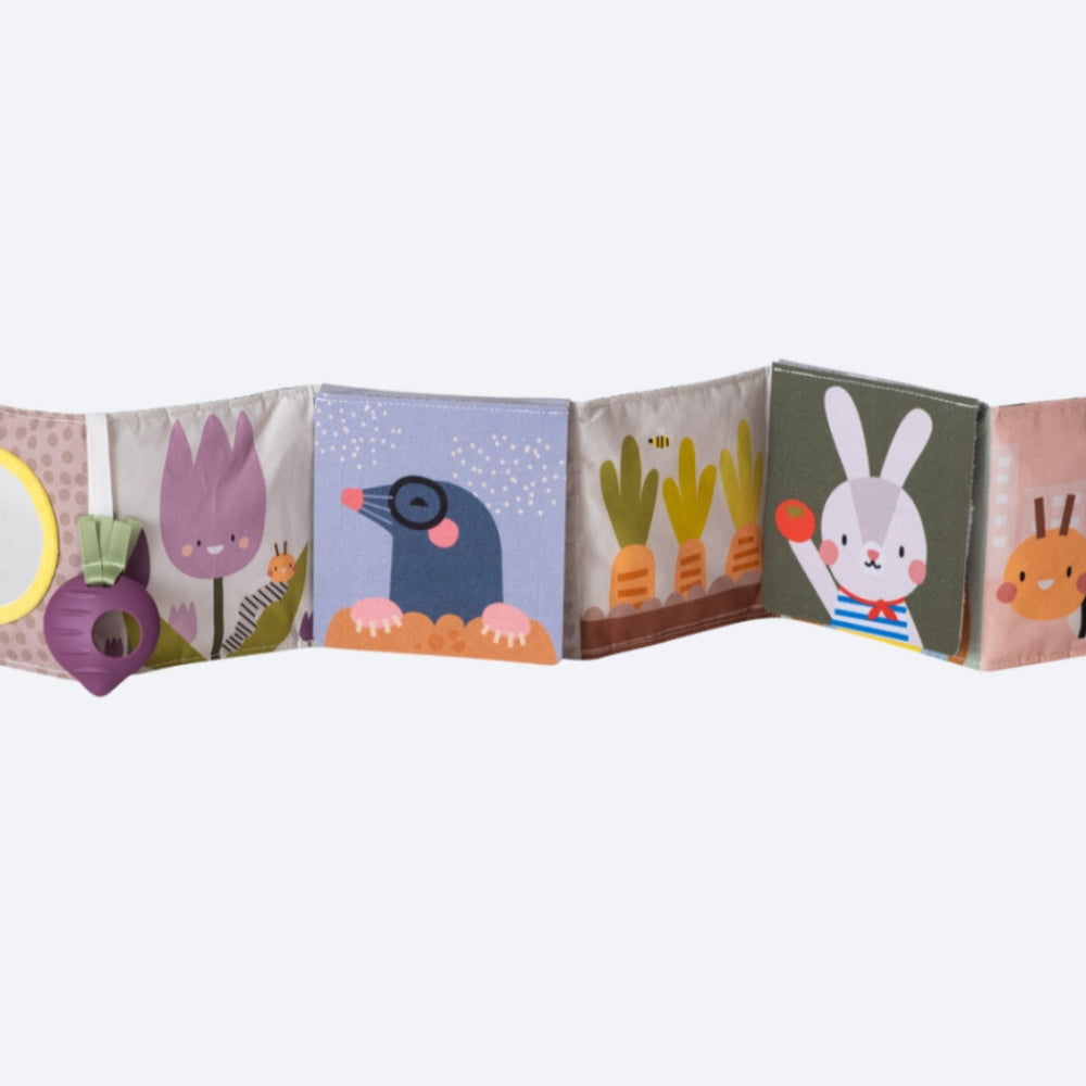 Urban Garden от Taf Toys е двустранна мека сензорна книжка за бебета с красиви илюстрации и занимания.