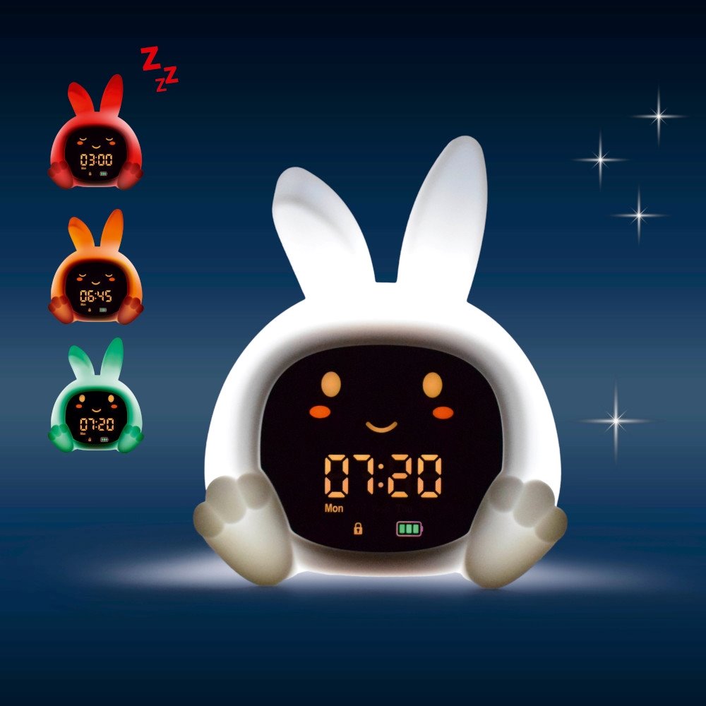 Er kombiniert die Funktionen eines Babyschlaftrainers mit einem mehrfarbigen Nachtlicht, einer Spieluhr und einem ersten Wecker.